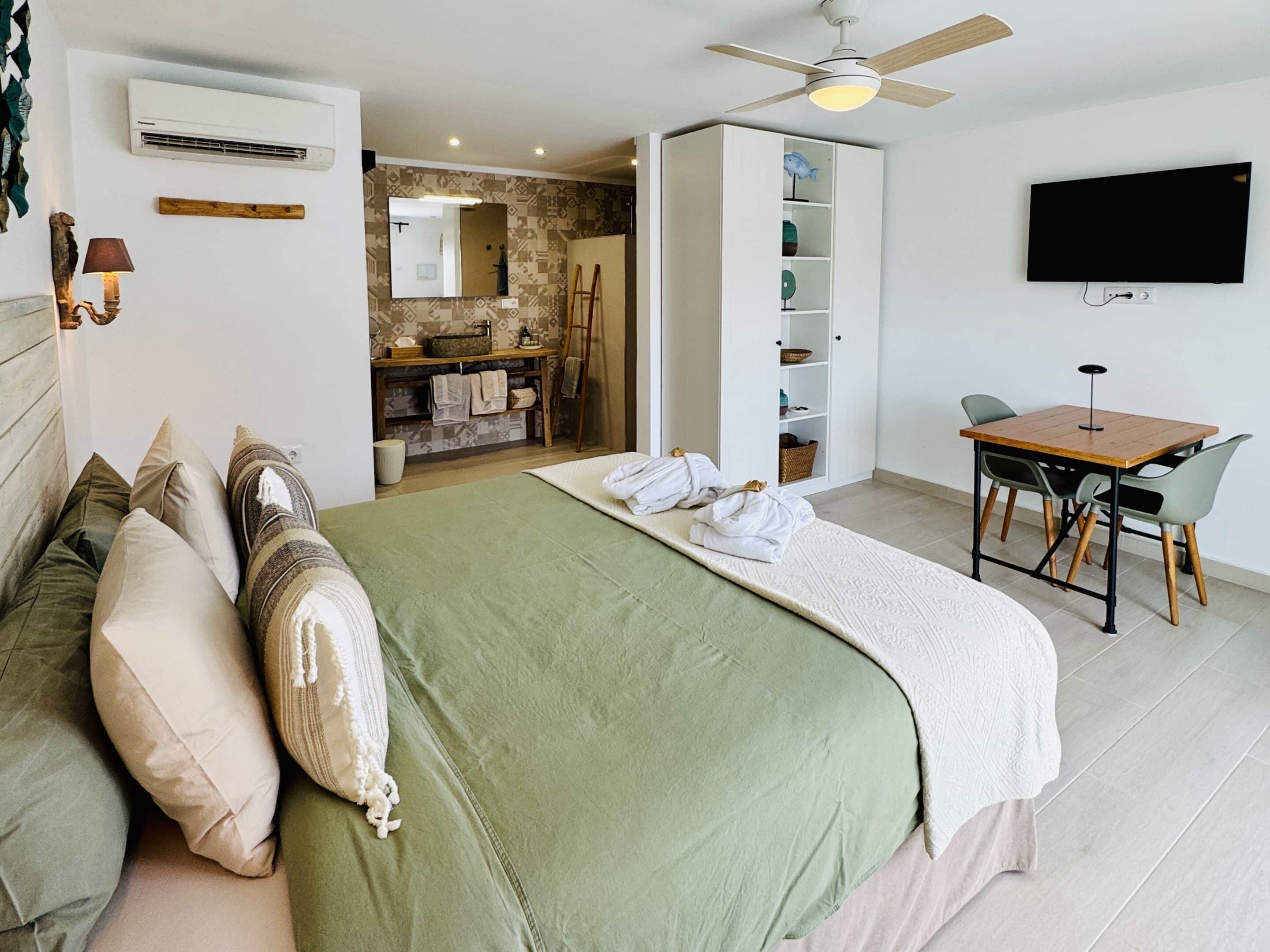 Bij Finca Pura verblijft u in één van de vier identieke tweepersoonskamers, ontworpen voor comfort, privacy en ontspanning. Elke kamer heeft een moderne ingericht en biedt directe toegang tot een eigen terras met uitzicht op het zwembad.