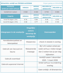 Let op: tijdens de wintermaanden verblijft u op basis van logies.